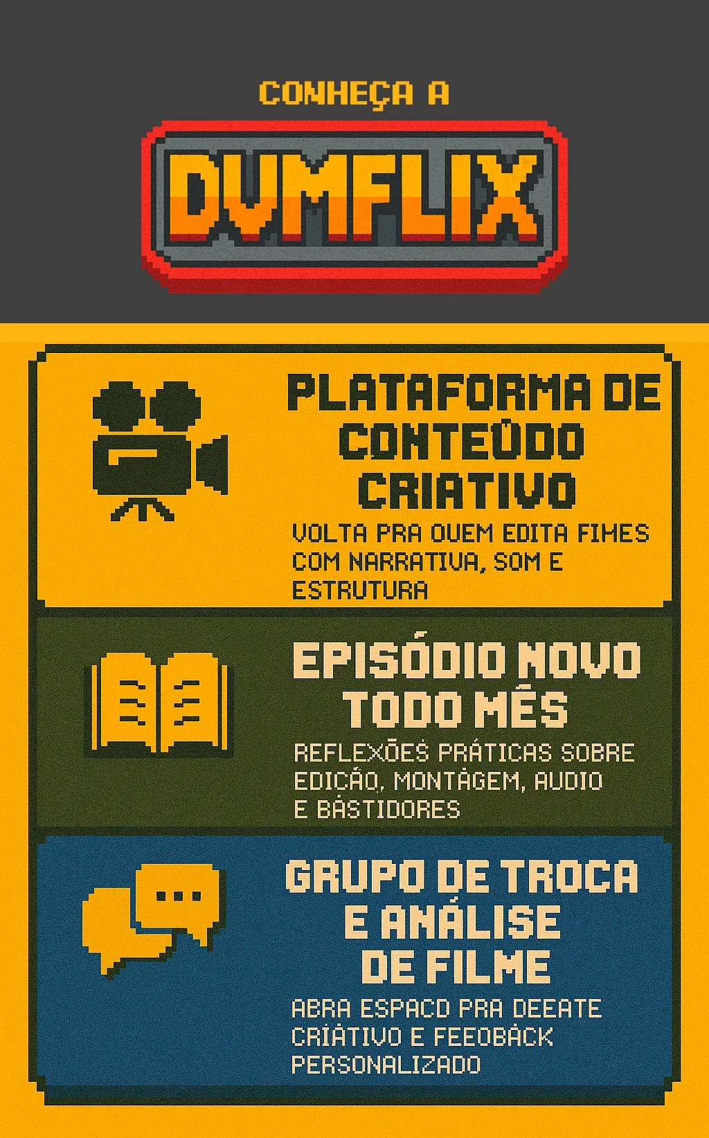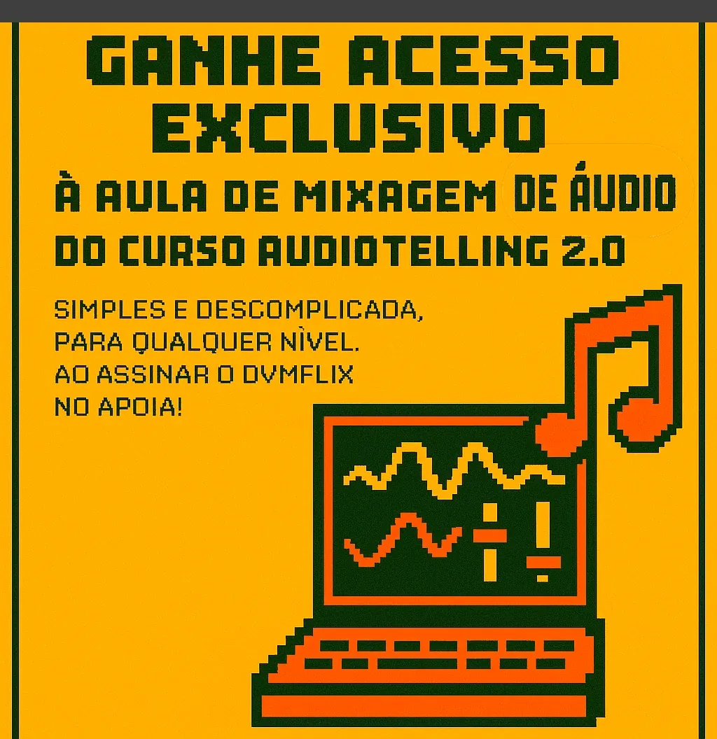 Após se inscrever no DVMFlix através da plataforma Apoia, você receberá acesso imediato aos conteúdos exclusivos, incluindo os filmes comentados e a aula do Audiotelling 2.0. Todo mês, novos materiais serão disponibilizados para que você continue aprendendo e aprimorando suas habilidades